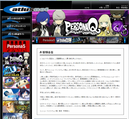 この発表に、ペルソナ4のキャラクター「クマ」もTwitterで「みんなに大事なお知らせクマ。ゲームブランド「アトラス」は2014年4月1日付けで株式会社アトラスとしてゲームを作ることになったクマ!クマたち頑張るから、みんな、これからもヨロシクマ!」とコメントを寄せている。
