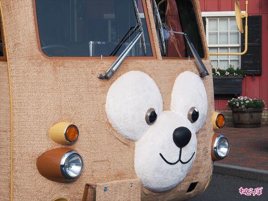 今回お披露目されたダッフィーバスは、ダッフィーのぬいぐるみと同じ生地でラッピングされていて、全体がもこもこになっています。バスの前部にはダッフィーの顔、後部はおしりや足をイメージしたデザインが施されています。まずはその全体をご覧いただきましょう。