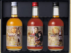 ラインアップは、「エルヴィン団長の梅酒」(熟成梅酒ゆめひびき)、「ハンジ分隊長の梅酒」(南高梅のこだわり梅酒)、「リヴァイ兵長の紅茶梅酒」(アールグレイ紅茶梅酒)の3種類。容量はいずれも500ミリリットルで、登場キャラクターのイメージにあわせた味になっているという。