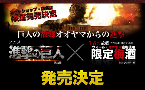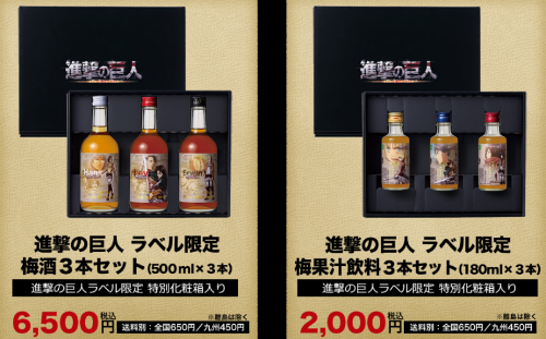 「進撃の巨人」とコラボした限定梅酒が、作者・諫山創さんの地元・大山町(大分県日田市)から発売される。価格は3本セットで6500円(税込)。