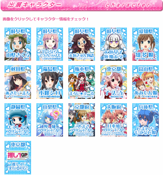 開催地・岐阜県の「山県さくら」や「大垣きゅん物語」をはじめ、秋田県からは西又葵先生のイラストをお米パッケージにして有名になった「あきたこまち」、コミケにも出展経験のある東京都八王子市の萌え寺「了法寺」、神戸新聞社の「いまいち萌えない娘」などが出展する予定。そのほかにも各都府県の魅力的なキャラクターたちが勢ぞろいします。これは盛り上がること間違いなし。
