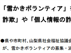 雪かきボランティアを装った振り込め詐欺に注意! 山梨県が呼びかけ