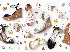 昨年12月のコラボに続く新商品。足の甲やかかと部分にキティの顔がたくさんつながって並んでいるファニーなウェッジサンダル「HELLO HELLO HELLO KITTY’s sandals」と、コルクヒールにキティの顔をプリントした「Playful HELLO KITTY’s wedge sole sandals」(ともに8526円)は予約受付中。ハート型の履き口とりんごのマークが特徴の「Finding an apple HELLO KITTY’s flat sandals」(6658円)は4月上旬に発売します。