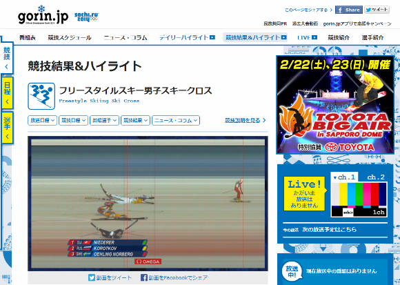 ソチ五輪で2月20日に行われたフリースタイルスキー男子スキークロス準々決勝第1組が、史上まれに見る展開となり、テレビ中継の実況&解説も大盛り上がりだったと話題になっています。特に、“ゴンちゃん”こと、三浦豪太さんの解説はテンションMAXで、名言を連発していました。一連のハイライトシーンを、民放テレビ局の五輪配信サイトNHKの特設サイトが公開しています。