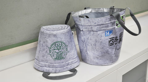 「大蝦夷農業高校謹製リアルバケツトート」(税込9660円)と「同リアルバケツミニトート」(税込6300円)の2種類。ブリキバケツの形と質感を再現したグレーのトートバッグに、エゾノーの校章と、八軒くんが書いたようなマジック書きのクラス名「酪農科1−D」、「大蝦夷農業高校謹製」のラベルをプリントした。