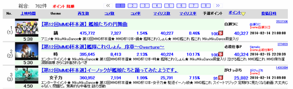 MMD動画のコンテスト「第12回MMD杯」の本選投票が3月3日に締め切られ、獲得ポイントの暫定集計値が公開されています。それによると、トップ1〜3位はいずれも「艦隊これくしょん」をメインにした作品(!)でした。2013年6月に誕生した新ジャンル(MMD艦これ)が、約半年で一大勢力となったことが伺えます。コンテストの詳しい結果は、8日の閉会式で発表されます。