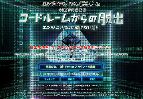 プログラミングやサーバ構築などで活躍しているITエンジニアをターゲットにしたリアル脱出ゲーム「コードルームからの脱出」が開催されています。