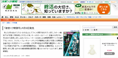 スポーツ報知は4月9日、「初音ミク特別号」(350円)を発売する。「ミクの日」である3月9日に発表した。