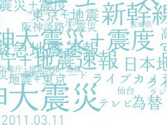 各キーワードの検索数を文字の大きさに換算して表したもので、時系列に表示することで、ユーザーが東日本大震災当時にどんな情報を欲していたのかが分かるようになっている。