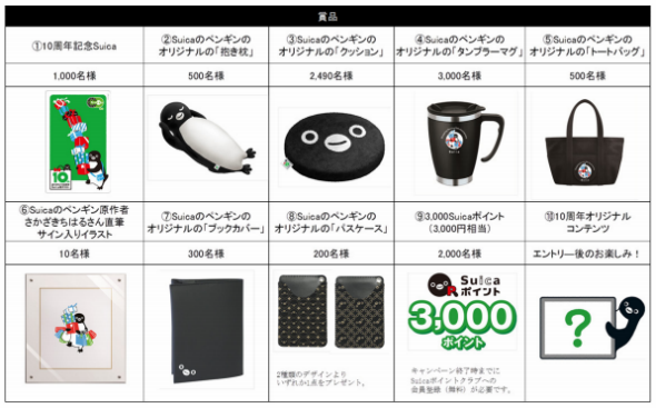 ほかにも記念企画として、3月20日から4月20日まで、10周年記念の景品が当たるキャンペーンを実施する。キャンペーンサイトに登録して、対象店舗で電子マネーを使って買い物をすると(税込100円以上の買い物を5回で1口)で、抽選でSuicaペンギンの抱き枕やクッションなどがもらえる。