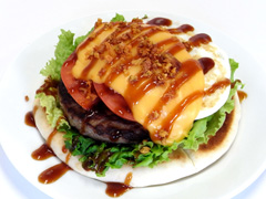 焼きたてのフォカッチャの上にパティと目玉焼き、野菜、チーズがのっています。トッピングのベーコンビッツ、フライドオニオン、チーズスプリンクルが歯ごたえと風味を演出。デミグラスソースをかけたボリューミーな一品です。