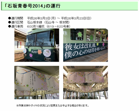 「満員電車も君とだったらアトラクション 」「彼女は改札機。僕の心の切符を吸い込んだ。」――京阪電気鉄道の石山坂本線で、“青春メッセージ”を車体にラッピングした「石坂青春号2014」が運行中だ。石山寺〜坂本区間で3月23日まで。
