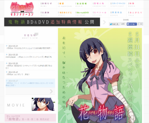 <物語>シリーズ(西尾維新)のアニメ「花物語」が5月31日から5週連続でテレビ放送されることが決まった。