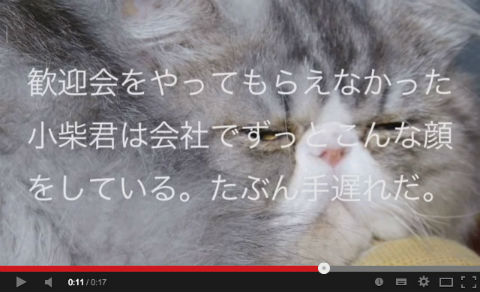 登場するネコちゃんはCM後半で表示される「歓迎会をやってもらえなかった小柴君は会社でずっとこんな顔をしている。たぶん手遅れだ。」というメッセージを表現しています。