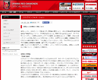 浦和レッズは3月26日、サポーターが差別的とみられる横断幕を掲出した問題について「浦和レッズの現状と今後について」とする告知を公開した。