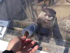 コツメカワウソは、石の隙間などに手を入れる習性があるそうで、多くの水族館や動物園でもこの習性を利用した握手コーナーが設けられているんだとか。パイプは常に開いていますが、カワウソが手を出してくれるかはカワウソの気分次第です。