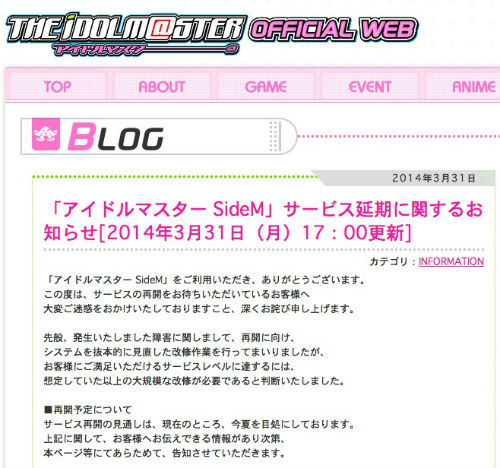 「アイドルマスターSideM」は男性アイドルを主役にした新しい「アイドルマスター」シリーズ作品。2月28日にサービスを開始したものの、リリース直後から障害が発生しサービスを一時中断。当初は3月上旬の再開を予定していましたが、その後3月末予定へと延期。そして「想定していた以上の大規模な改修が必要」として、今回の延期となりました。サービス再開を楽しみにしていた人にとっては残念なお知らせです。