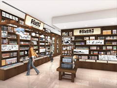 手塚作品のマンガ単行本はもちろん、画集や絵本、他の作家がリメイクしたコラボ作品の単行本や、マンガ研究者などが執筆した関連書籍などを一堂にそろえた専門店。手塚プロダクションと丸善書店が共同で展開し、現在流通している手塚作品の関連本全てをそろえることを目指すという。