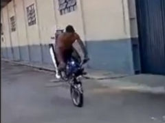 向こうからスーッとこちらに走ってくる1台のバイク。上半身裸の屈強な男性が乗ったそのバイクは、よく見ると後輪を浮かせて前輪だけで走る「ジャックナイフ」の体勢で突っ込んできます。そのままくるっと回転して、鮮やかに駐車スペースに着地。横で見ていた男性も思わずカメラを振り返って苦笑いしています。