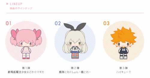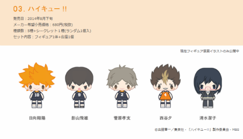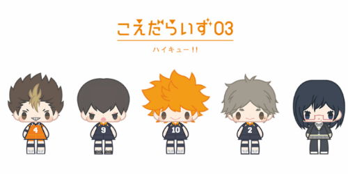 「ハイキュー!!」のこえだらいずは日向翔陽、影山飛雄、菅原孝支、西谷夕、清水潔子の5種に加えシークレット1種が登場。公式サイトでフィギュア原案イラストが公開されている。セット内容はフィギュア1体と台座1個。ランダム1個入りで価格は680円(税別)。