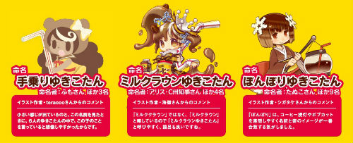 選ばれし6人のゆきこたんたちの名前はそれぞれ「メイドロイドゆきこたん」「牛っ娘ゆきこたん」「スイートジェットゆきこたん」「手乗りゆきこたん」「ミルククラウンゆきこたん」「ぼんぼりゆきこたん」となりました。応募総数およそ1万件のアイデアから選ばれた名前はどれも各ゆきこたんの特徴を表していますね。