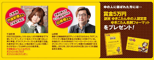 すでにセンターのうしっ娘ゆきこたんの担当声優として、人気女性声優・竹達彩奈さんの起用が決定。詳しい応募ルールや参加方法についてはオフィシャルページでご確認ください。