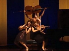 このステージは4人のメンバーが変わった弾き方を競い合うという構成。チェロやバイオリンをひっくり返して弾いてみたり、ギターのようにかき鳴らしたり、お互いの楽器を弾きあったりと実にさまざまな演奏方法を披露しています。寝転んでピアノを弾きながらチェロでベースラインを弾くといった合体技も。それでいて演奏にはほとんど乱れがないのもすごいです。