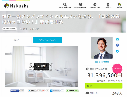 サイバーエージェント・クラウドファンディングが運営するサービス「Makuake」で支援を募っていたプロジェクト「世界一のメンズフェイシャルエステを造り、『日本の男はカッコいい!』未来を創る」が4月21日、目標金額の3000万円を達成した。国内のクラウドファンディングでは史上最高額となる。