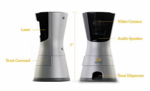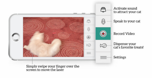 Kittyo本体にはビデオカメラやスピーカー、レーザーポインター、おやつを入れておけるディスペンサーが付いています。部屋に設置して自宅のネット環境に接続すると、専用のスマートフォンアプリから外出先でも留守番中のネコの映像を見てたり、レーザーポインターで一緒に遊んだり、ネコを呼ぶ音を出したり、ネコに直接話しかけたり、おやつをあげることができちゃいます。