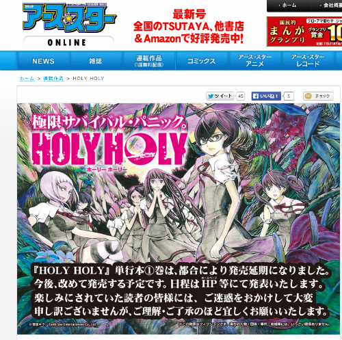 韓国で起きた旅客船沈没事故を受けて、アース・スター・エンター・テイメントは5月12日に予定されていた同社のコミック「HOLY HOLY」第1巻の発売を延期すると発表した。