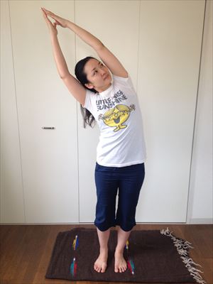 4. 左側に倒れたら、3回呼吸をします。体が前に倒れてしまわないよう、脇腹をしっかり伸ばしてください