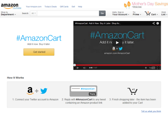 TwitterアカウントでAmazonの連携アプリを認証すると利用できるようになり、以降は、Amazon.comとAmazon.co.ukの商品リンクを含むツイートに、ハッシュタグ「#AmazonCart」(米)「#AmazonBaske」(英)を付けてリプライすることで、それぞれの商品がカートに自動追加される。