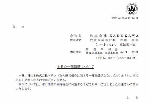 ドワンゴとKADOKAWAは5月14日、両社が経営統合するという日経の報道についてコメントした。