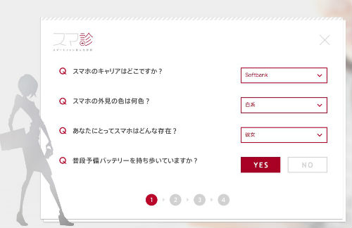 「スマホのキャリア(契約回線)」や「スマホの外見」といった簡単な質問に答えていくと、自分のスマホのキャラが分かります。