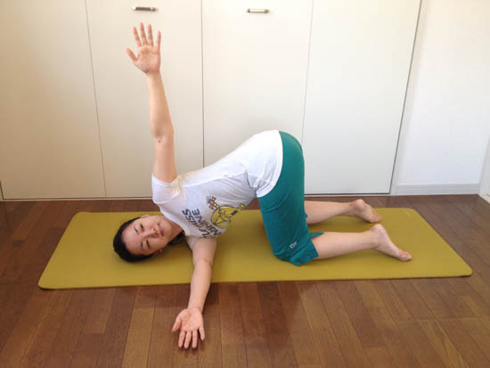 5. 5回呼吸が終わったら手を床に戻し、四つんばいに戻り、今度は左手を右手の下に持っていき、5回呼吸しましょう。