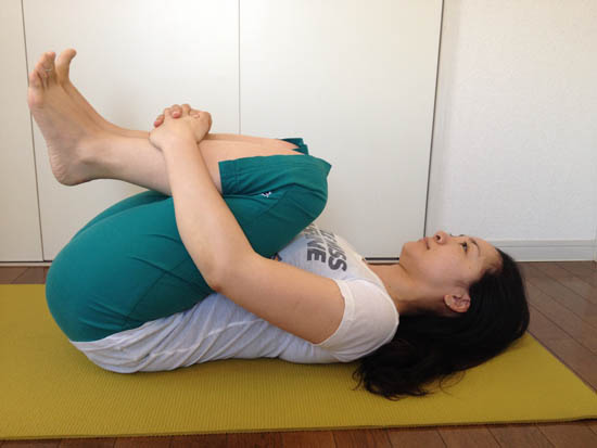 5. 5回呼吸をしたら仰向けに戻り、今度は両足を胸の前で抱えます。