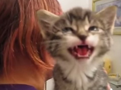 飼い主さんの肩にちょこんと乗っている小さな子ネコ。「あなたはかわいい?」と聞くと元気よく「ニャー!」、「お腹が空いた?」と聞くと恥ずかしそうに「ニャー」。もしかして会話ができるのかな、と思ったら「あなたはリス?」という質問にも自信満々で「ニャー!」と答えています。そんなオトボケなところもまたかわいいです。