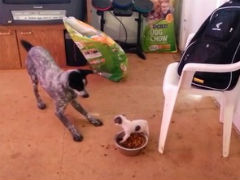 ひとつの皿でエサを分け合う2匹の犬。しかし、片方の成犬とは比べものにならないほど小さな子犬が、エサを独り占めしようと皿に覆いかぶさって離れません。成犬が近づこうとすると大きな声で吠えて威嚇する子犬。そのすさまじい気迫に成犬のほうが完全に尻込みしています。