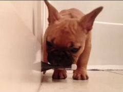 これなんだワン? ドアストッパーに興味津々のフレンチブルドッグがほほえましい