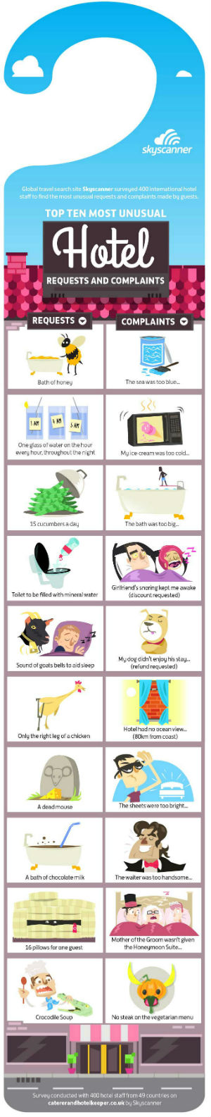 400の国際的なホテルに、宿泊客から寄せられた奇妙な注文を調査した結果で、ワニのスープやチョコレートミルク風呂など、食べ物や風呂・トイレに関するものが多くを占めています。奇妙な注文トップ10は以下の通り。