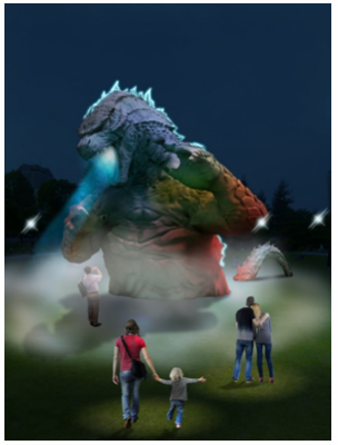 実物(全長108メートル)のおよそ7分の1サイズのゴジラのオブジェが芝生広場に設置される。夜にはライトアップもあり、30分に1回、光とミストと音を使った特別演出を行う。ゴジラのそばには実物と同じ、縦横約18メートルの足跡も設ける。ライトアップは午後6〜11時、特別演出は午後7〜9時。