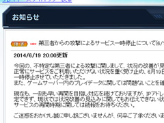 6月19日午後11時時点のお知らせによると、攻撃は依然継続しており、今夜中の復旧は難しい状況とのこと。さらなる続報は20日午後1時に発表される予定。また21日の「ファンタシースター感謝祭2014」大阪会場については、当日のサーバー状況にかかわらず開催されるそうです。