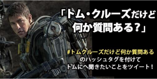 このハッシュタグをつけてあなたがトム・クルーズさんに聞いてみたいことを投稿すれば、もしかすると本人自ら質問に答えてくれるかもしれません! もちろん日本語でオーケー。実施日は27日の午前中を予定しており、質問の答えはワーナーエンターテイメント ジャパン公式アカウントでツイートするそうです。