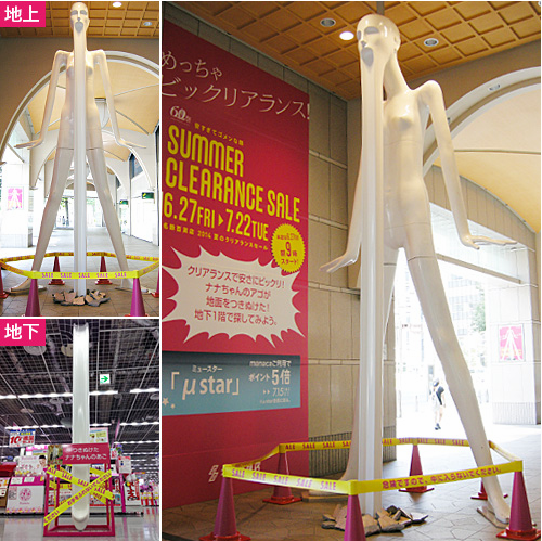 ロング・ロング・アゴ 名鉄百貨店ナナちゃん人形のあごが伸びすぎて地面突き抜けとる