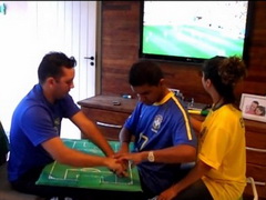 目と耳に障害のあるカルロスさんに、ブラジルW杯開幕戦を楽しんでもらいたいと考えたフォンセカさん。手作りで小さなサッカーコートを作り、その上でカルロスさんの手を動かして試合の状況を伝えるという方法を考えました。また、カルロスさんの背中からはフォンセカさんの奥さんが選手の背番号やファウルなどの情報を伝達。これにより試合の状況が細部までリアルタイムで分かるようになっています。