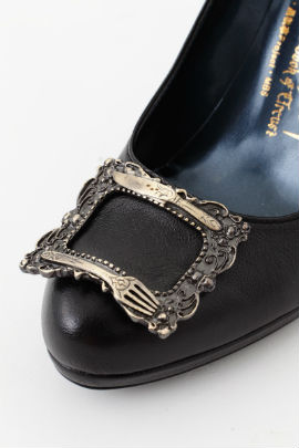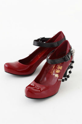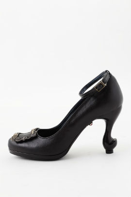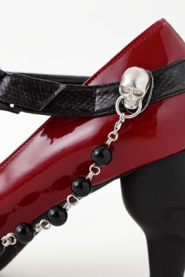 セバスチャン・ミカエリスモデルパンプス(税別1万7800円)はフォークとナイフをビンテージフレーム風のパーツで表現した。シエル・ファントムハイヴモデルブーティ(税別1万9800円)はバタフライタイと外套(がいとう)をモチーフにしたデザインで、外套パーツは脱着可能。グレル・サトクリフモデルパンプス(税別1万7800円)はスカル型ヒールを採用し、グレルのグラスコードをイメージしたチェーンがついている(取り外し可能)。