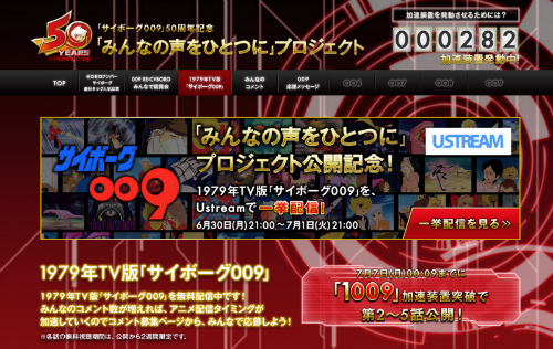 「サイボーグ009」50周年を記念した「みんなの声をひとつに」プロジェクトの一環。1話は10月29日までアーカイブ映像を視聴できる。2話以降はTwitterでハッシュタグ「#加速装置」を付けてツイートされた回数に応じて、アーカイブ映像を視聴できる話数を追加していく。例えば2〜5話は「#加速装置」付きツイートが1009を超えるとアーカイブが公開される。