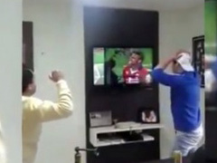 テレビの前に立ってPK戦を見守っている男性。チリの最後のキッカーがシュートを外した瞬間、友人たちと抱き合って大はしゃぎが始まります。さらにテレビ画面にシュートを外したチリの選手が映し出されると、「どんなもんだ!」と言わんばかりに画面を平手打ち。興奮状態で力加減が分からなかったおじさん、案の定テレビ画面は壊れチリの選手が張り付いたまま動かなくなってしまいました。
