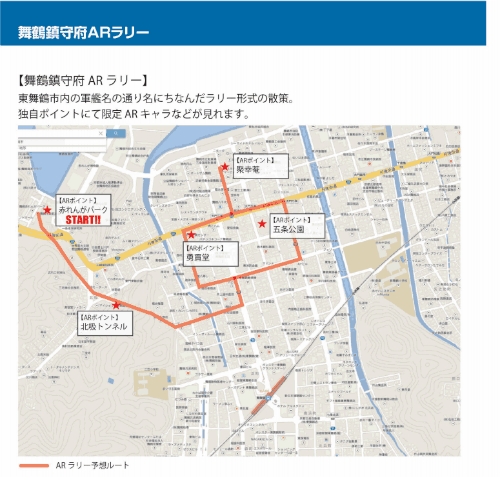 スマートフォンで合計5カ所に設置されたARコードを読み取るだけで、各キャラクターたちによる名所案内が楽しめるそうです。イベント前日の7月12日に開催される「舞鶴鎮守府巡りツアー」とセットになっています(ARラリーは13日も開催)。ツアーは舞鶴観光協会の協力を得て、海軍記念館などを巡る内容です。