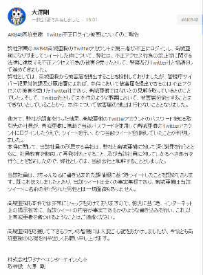 AKB48の高城亜樹さんのTwitterアカウントが第三者に乗っ取られた件について、ワタナベエンターテインメントが、取引先の社員によるものだったと報告した